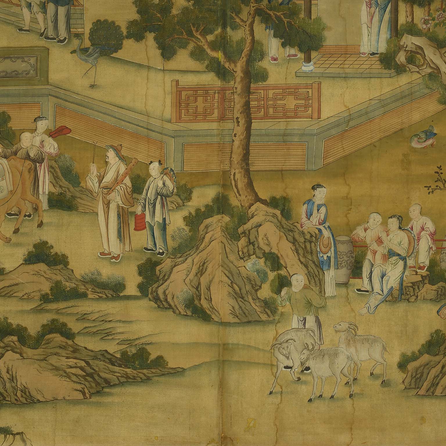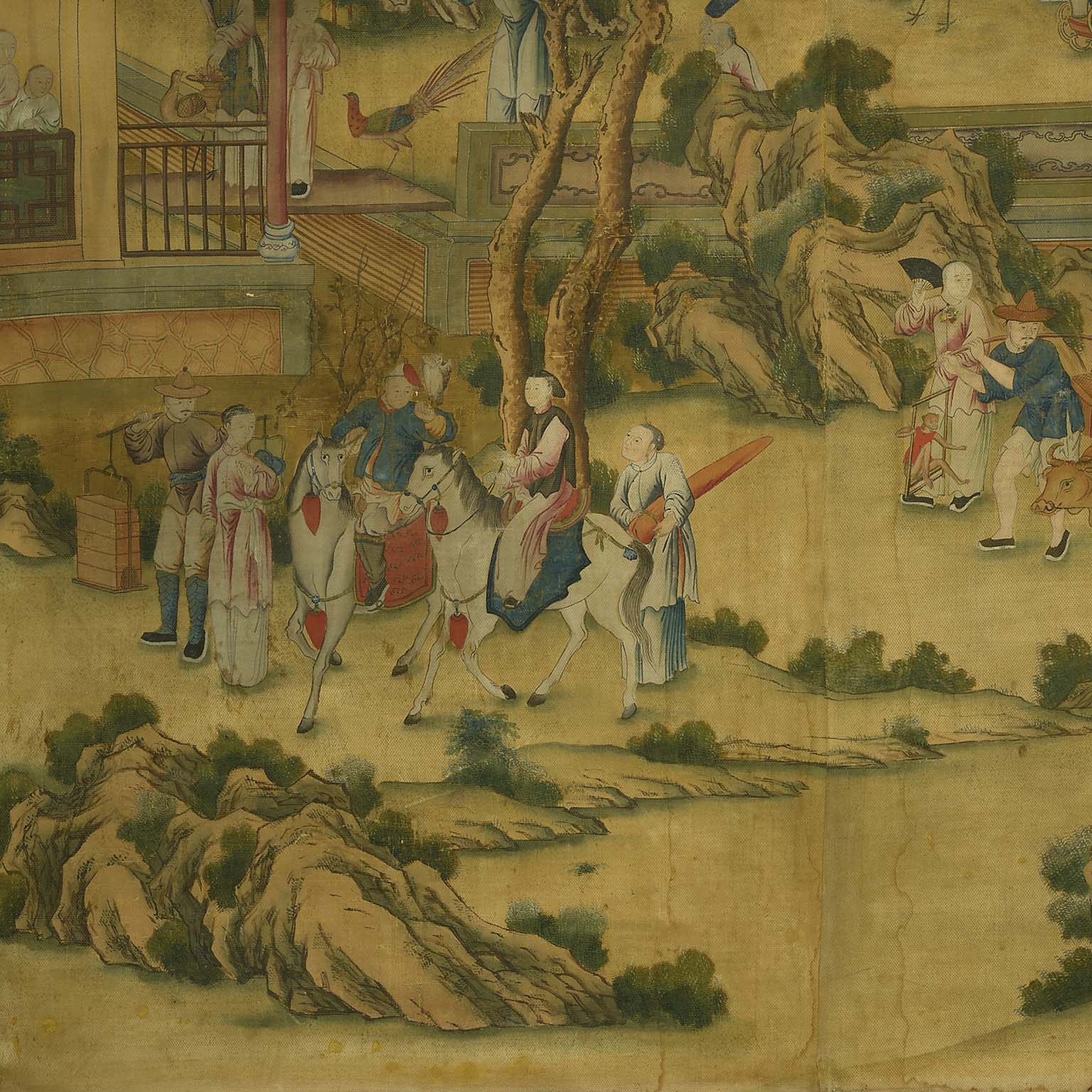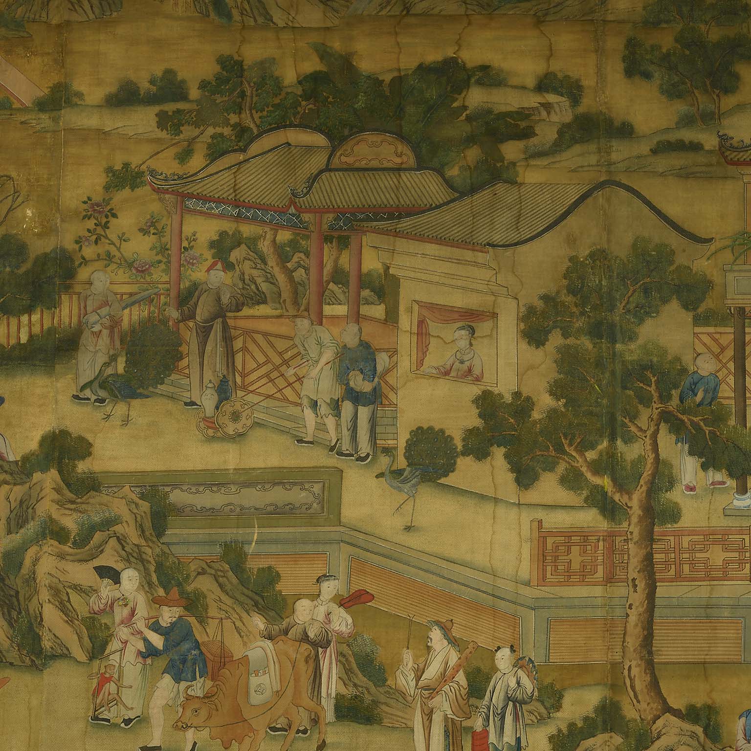 It is extremely rare to find such a large panel painted onto linen. More commonly scenes like this one were included on Chinese wallpaper, which was popular in Europe throughout the eighteenth century. A painting in bodycolour on linen, much like the present example but considerably smaller, was bought back to England in 1800 and can now be seen in The Royal Pavilion, Brighton.