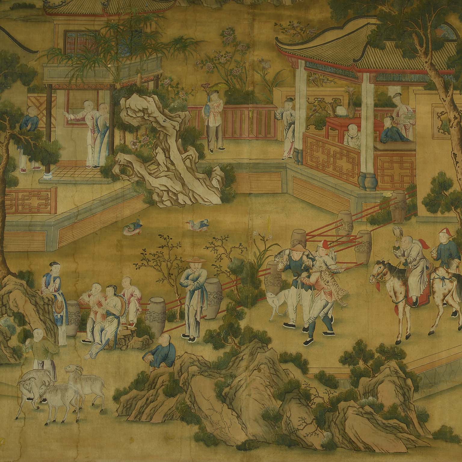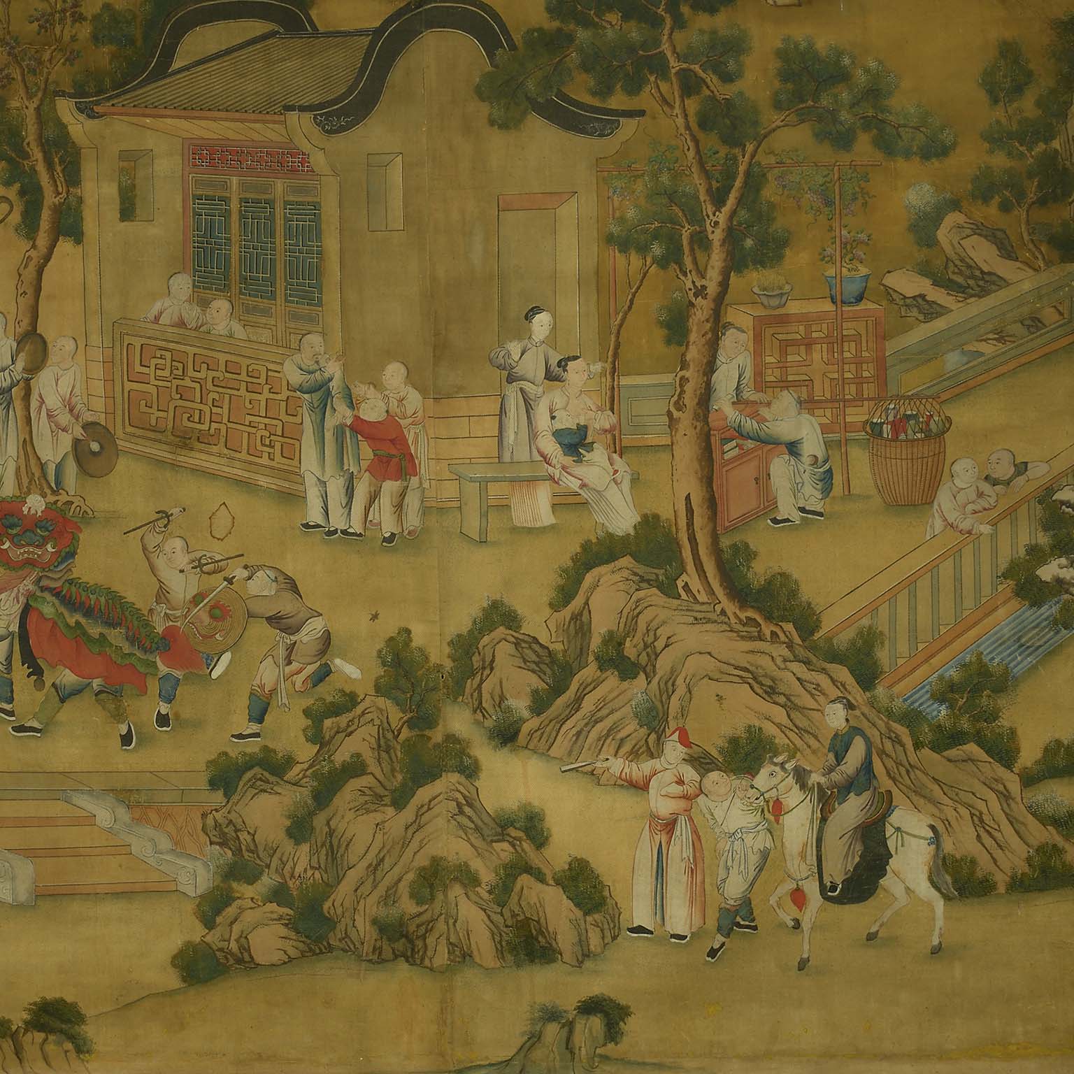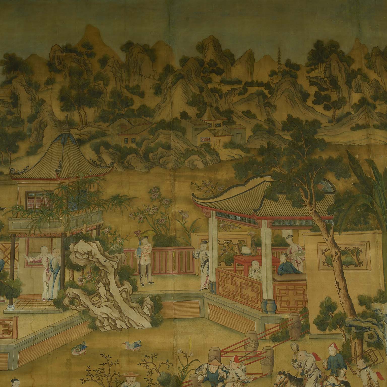 It is extremely rare to find such a large panel painted onto linen. More commonly scenes like this one were included on Chinese wallpaper, which was popular in Europe throughout the eighteenth century. A painting in bodycolour on linen, much like the present example but considerably smaller, was bought back to England in 1800 and can now be seen in The Royal Pavilion, Brighton.