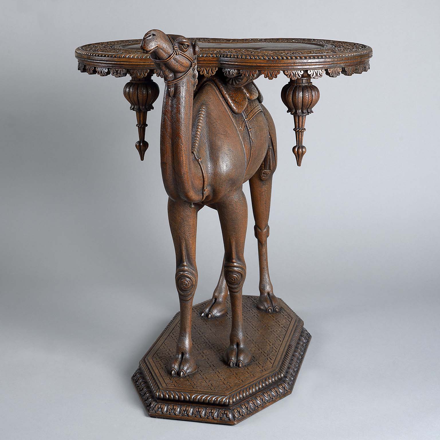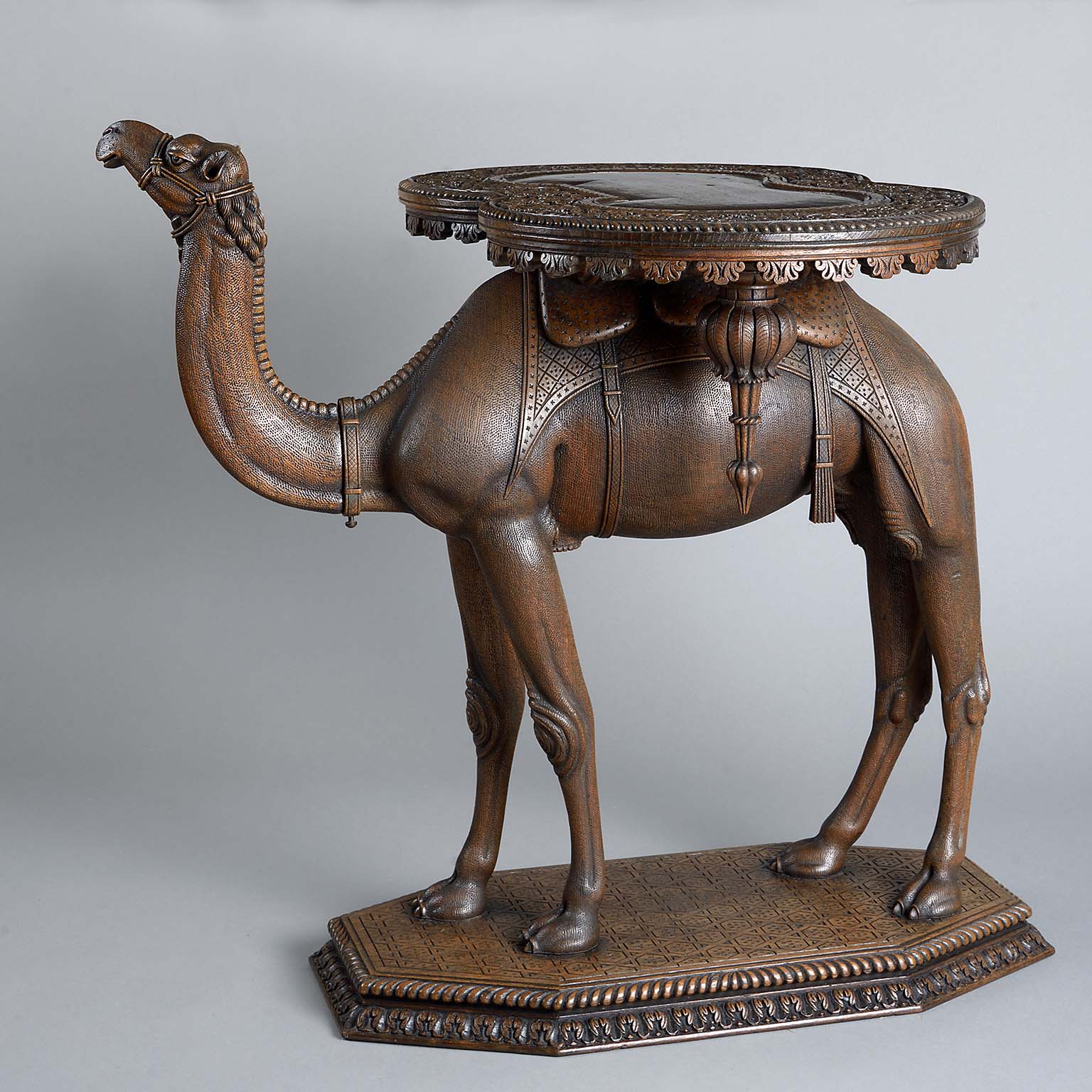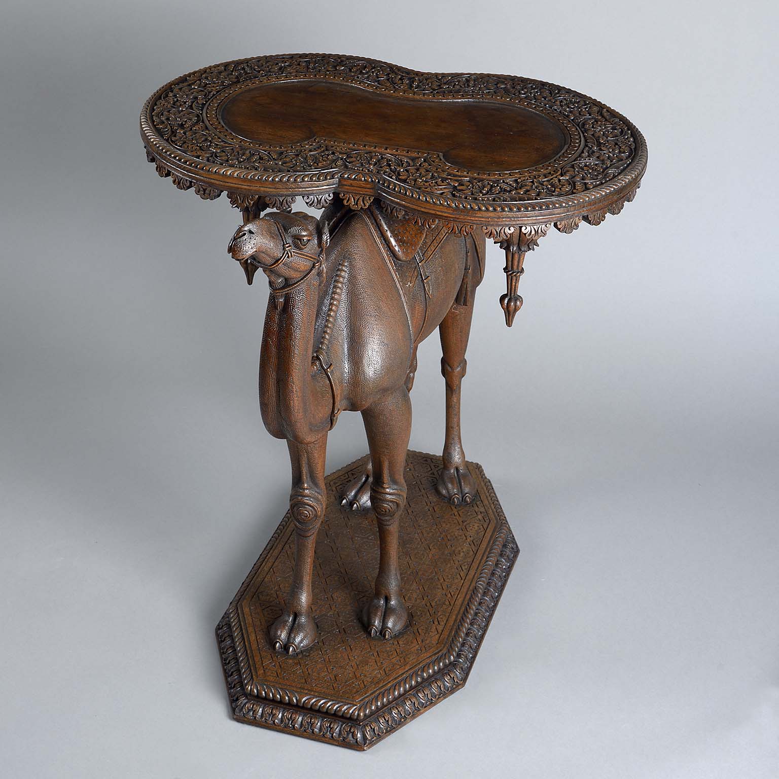 This exceptionally fine camel table is carved in the round and stands on an octagonal stepped pedestal base. The design is worked in relief with foliate patterns, a rope like decorative band with hexagonal stellar motifs to the base. The realistically carved camel with cushions, saddle and rug on its back has a saddle shaped table top with a plain central section surrounded by a profusely carved floral and foliate design with a gadrooned edge. On either side below the table top are two elegantly carved lotus buds with bulbous column finials, reminiscent of Indian architectural decoration.