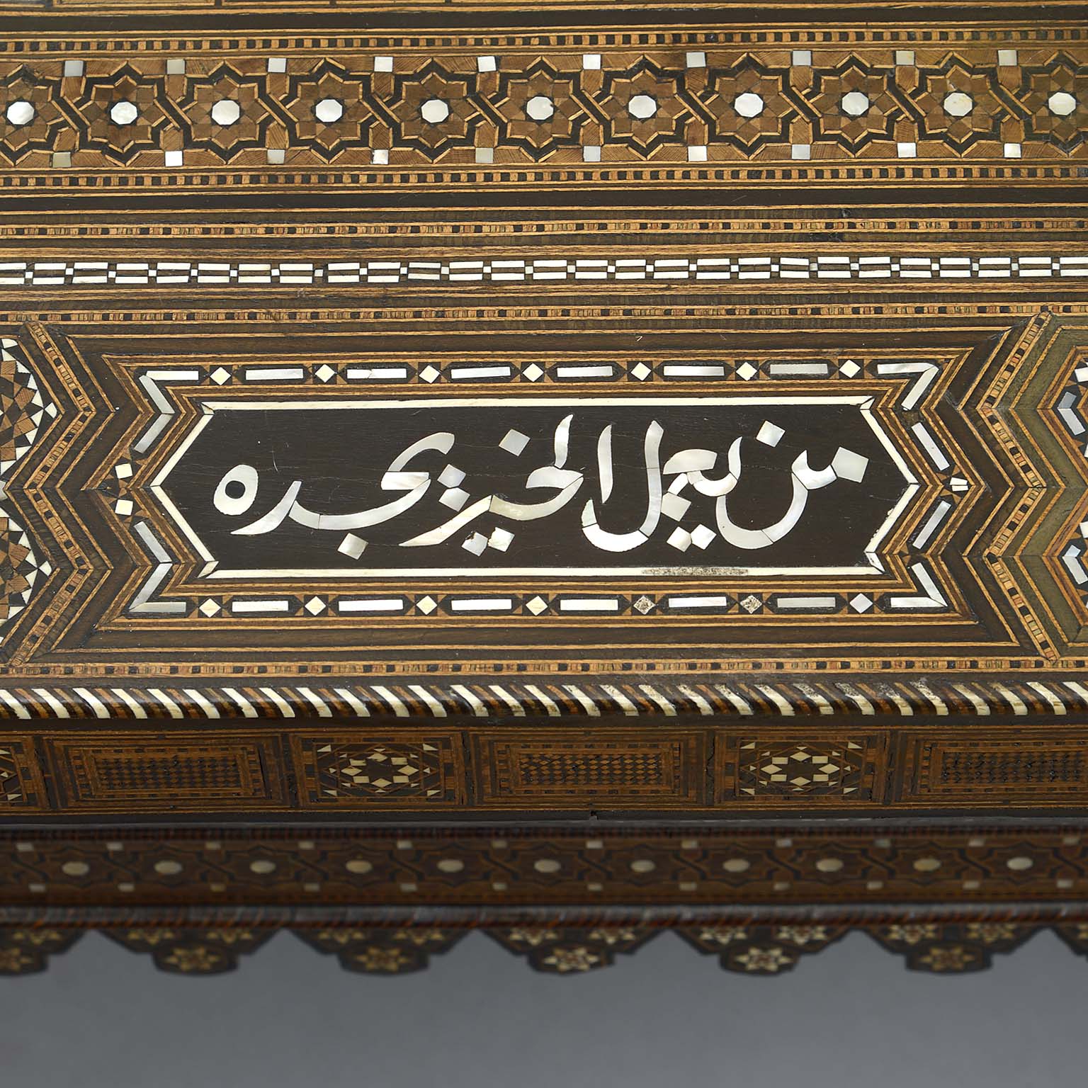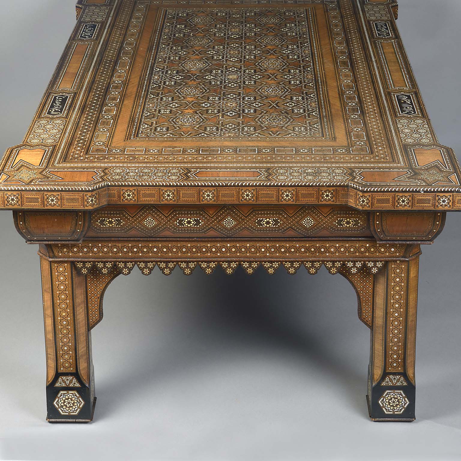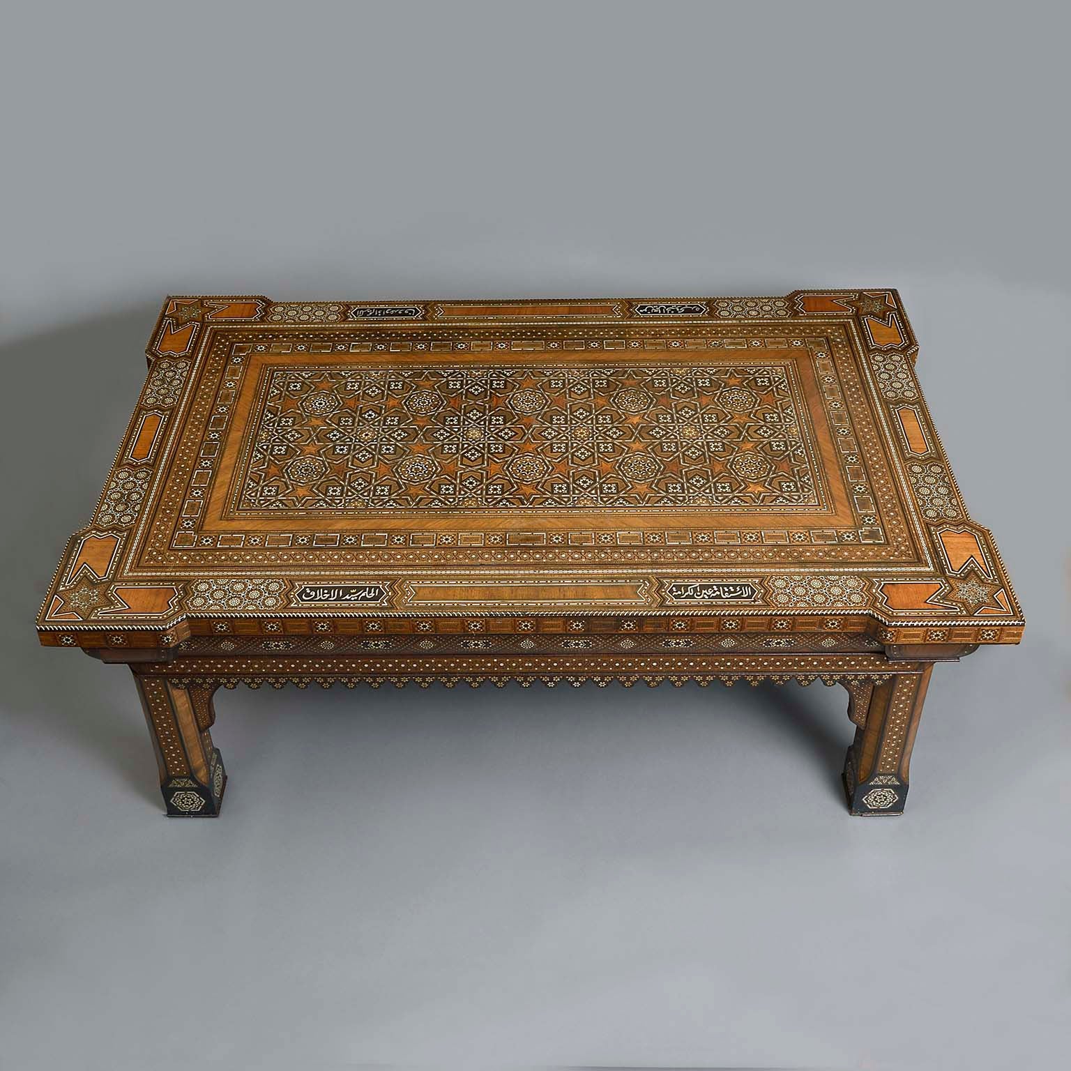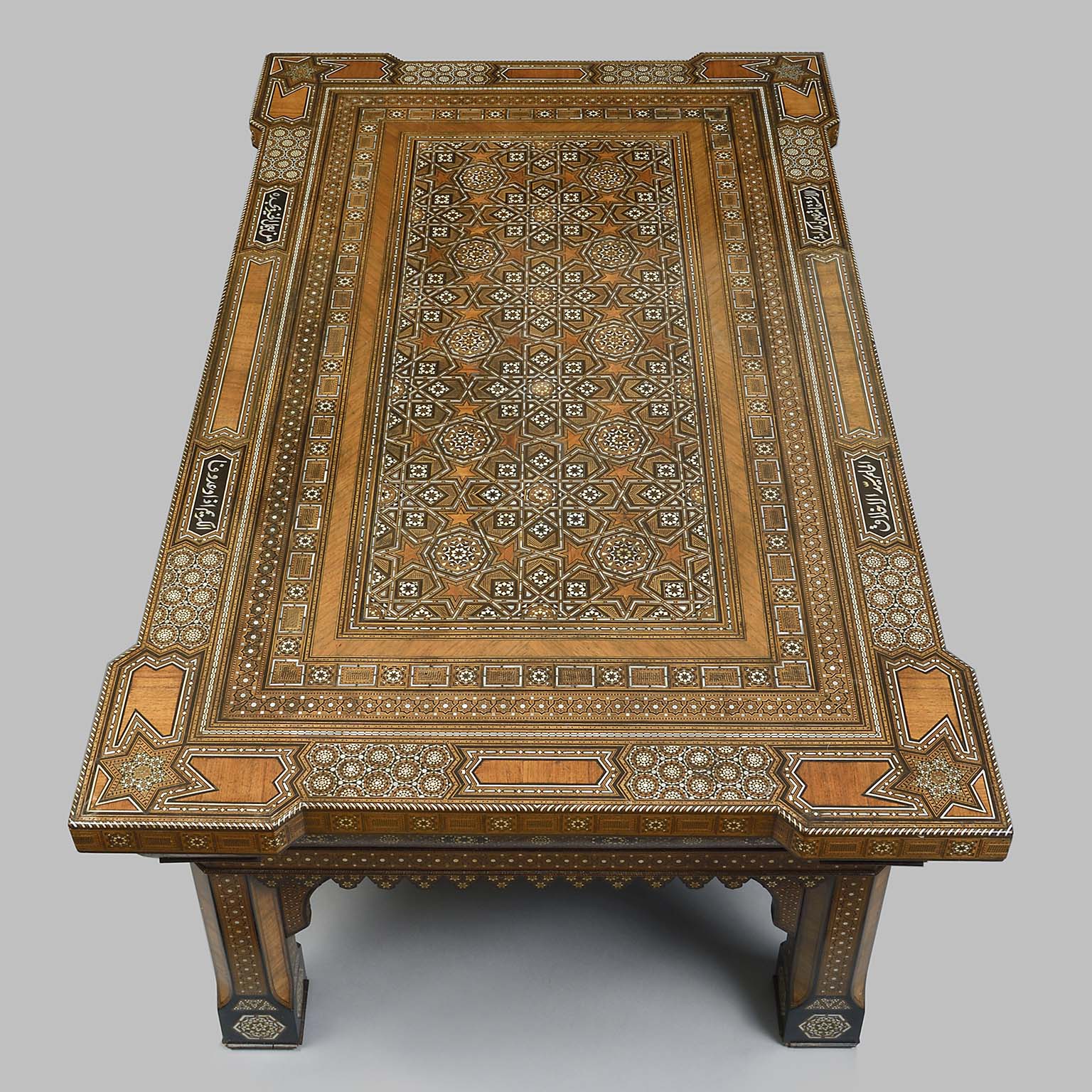 Islamic Geometric Bone Inlaid Low Table of Substantial Proportions Bearing Proverbs in Arab Calligraphy
