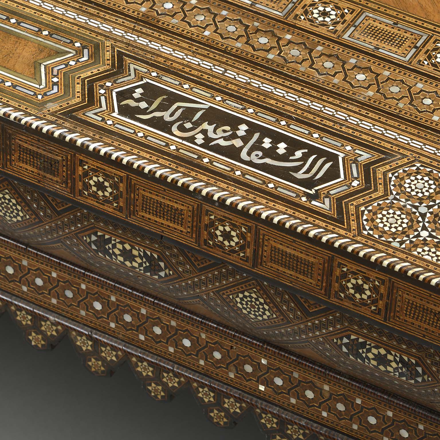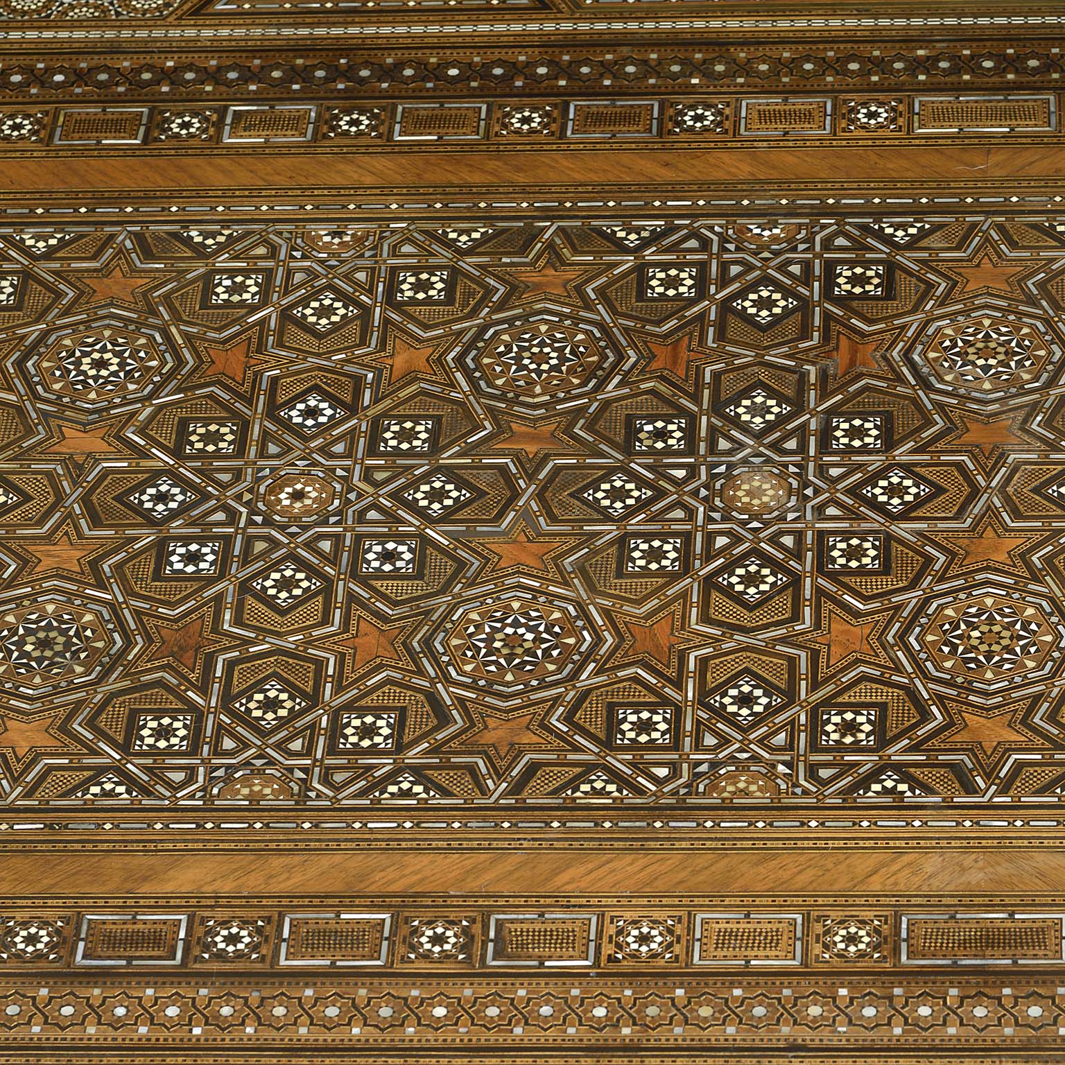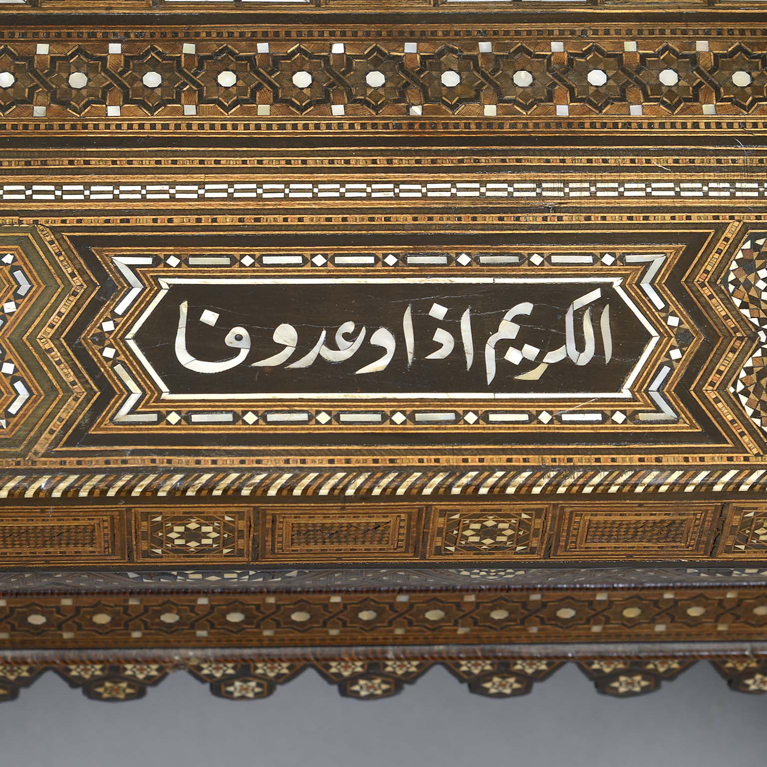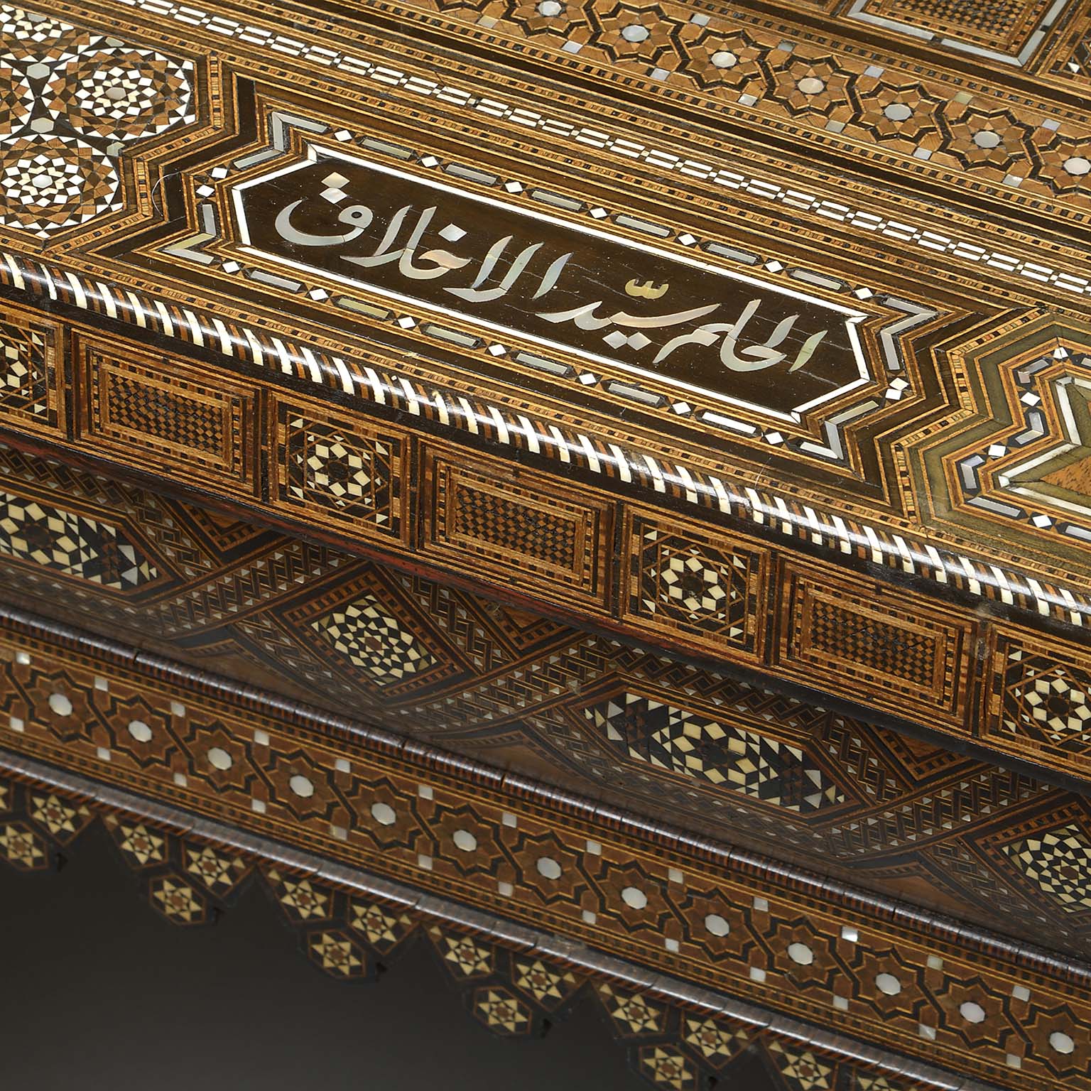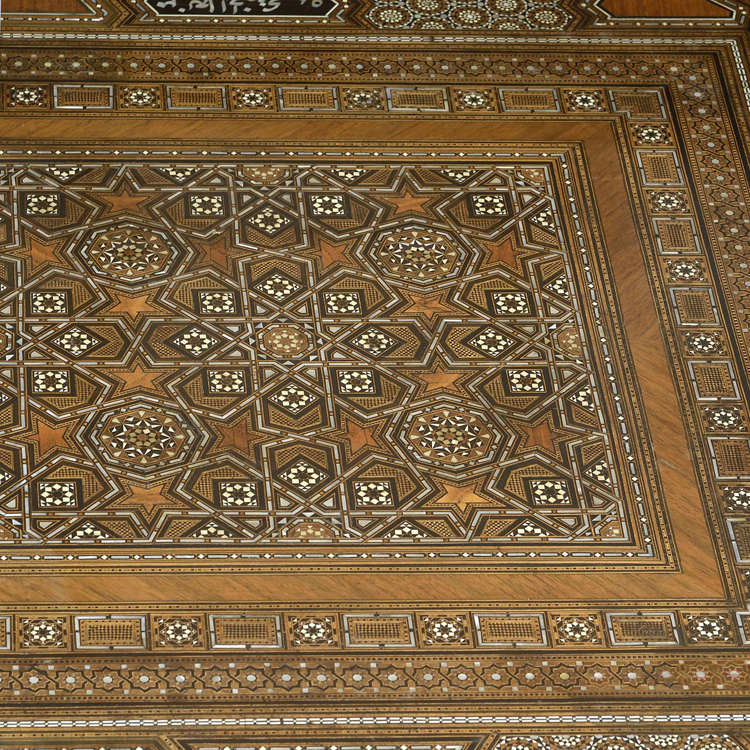 Islamic Geometric Bone Inlaid Low Table of Substantial Proportions Bearing Proverbs in Arab Calligraphy